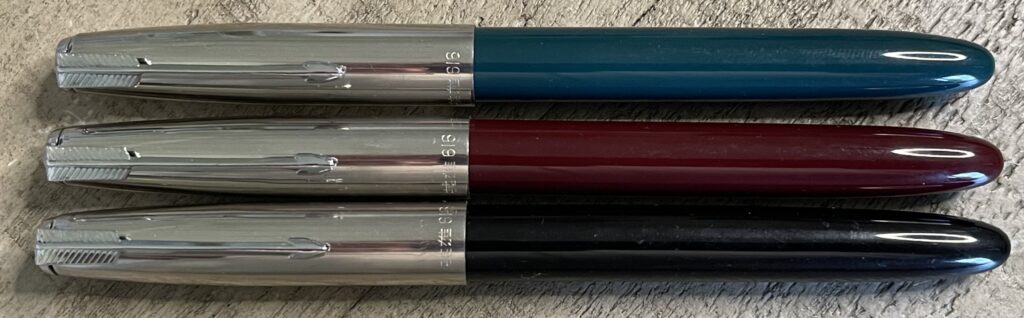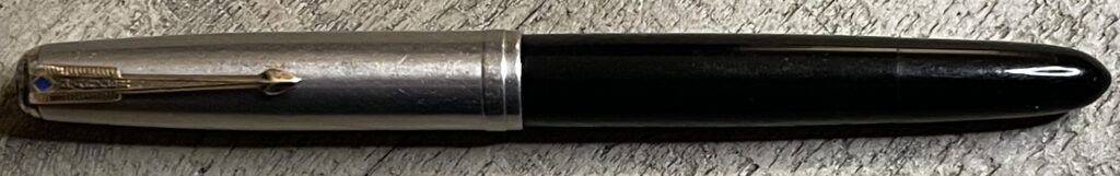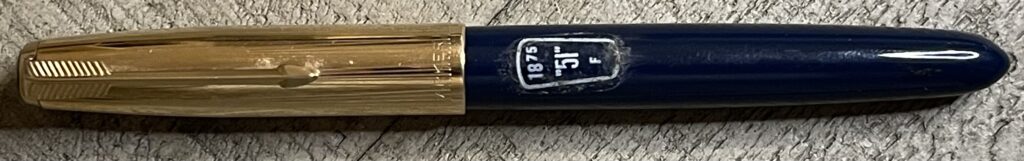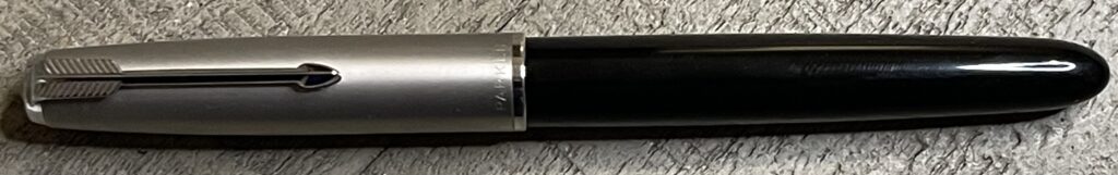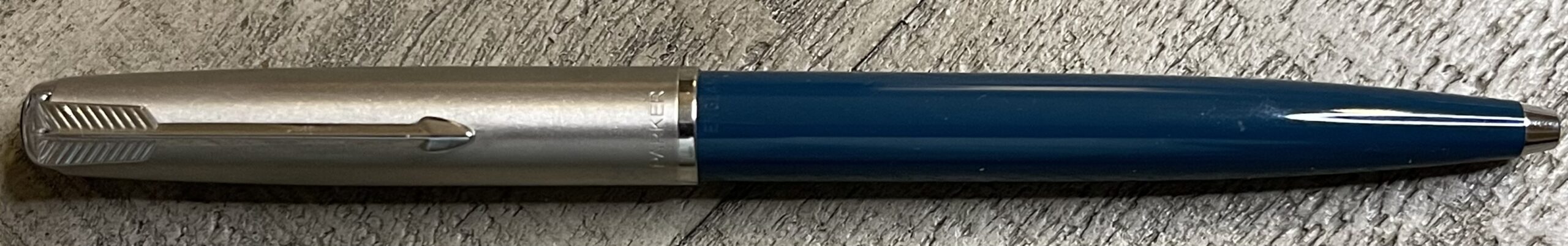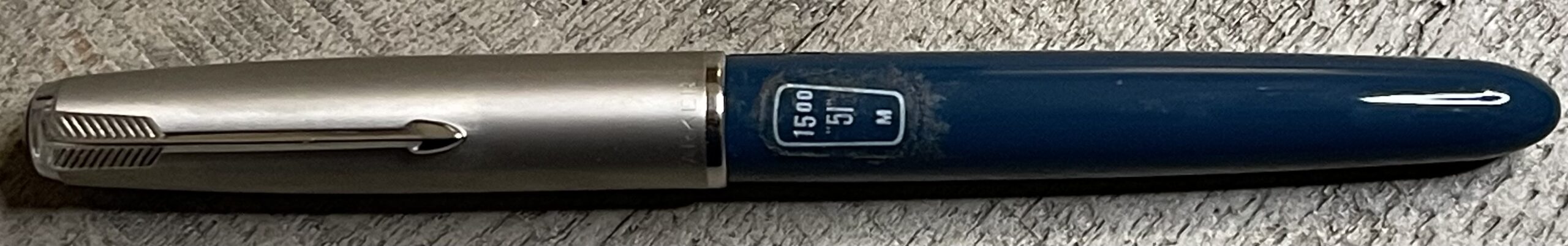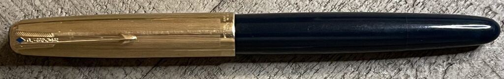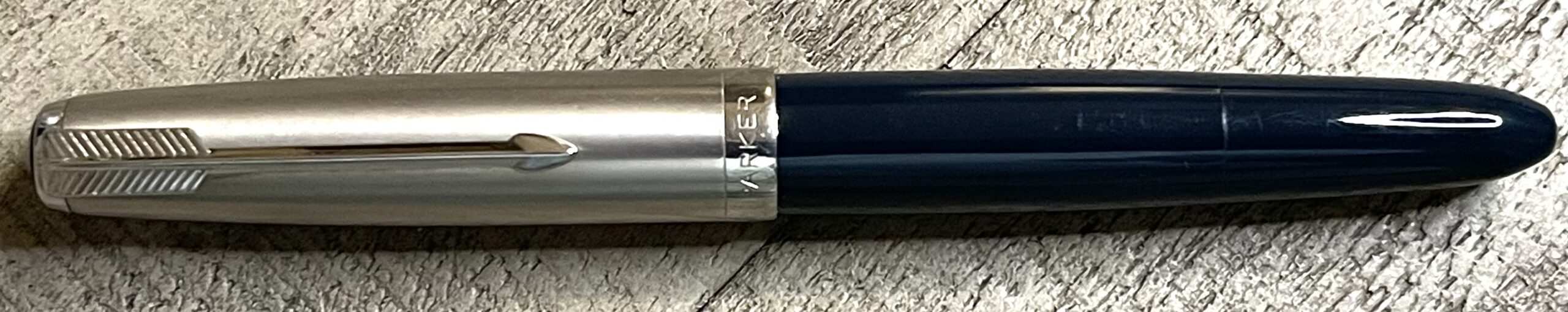 JV465. PARKER “51” Aerometric MK3 in Navy Blue with Lustraloy cap. Nice frosty cap with no dents or dings. Very late production model with squared ends. 14k medium nib. Completely restored and working, $175