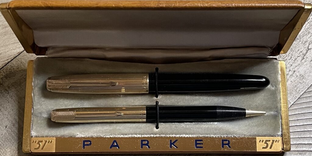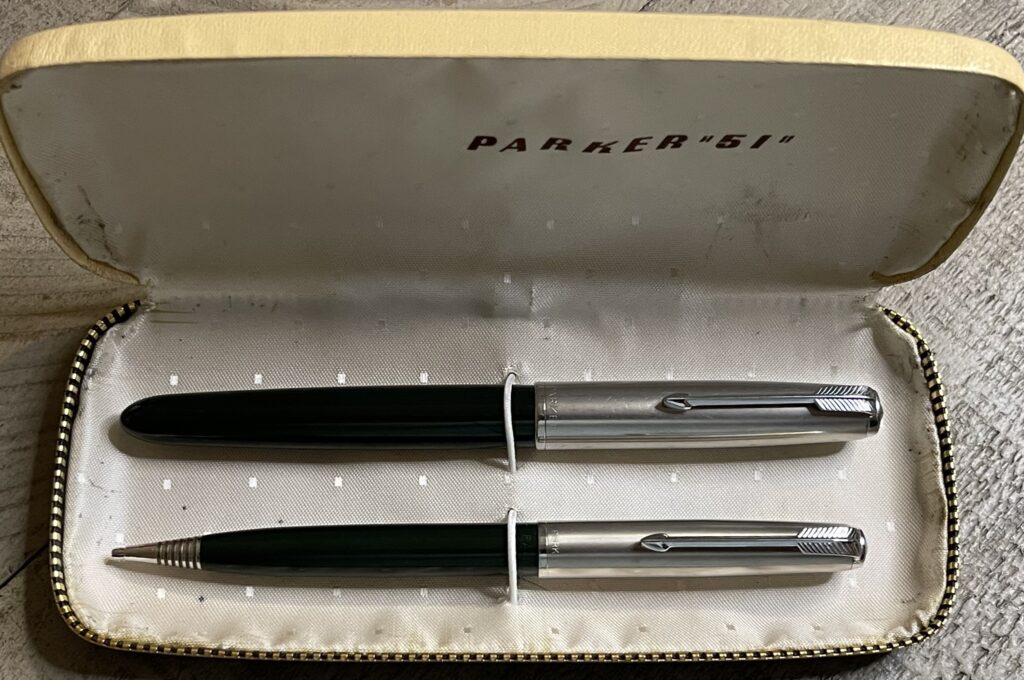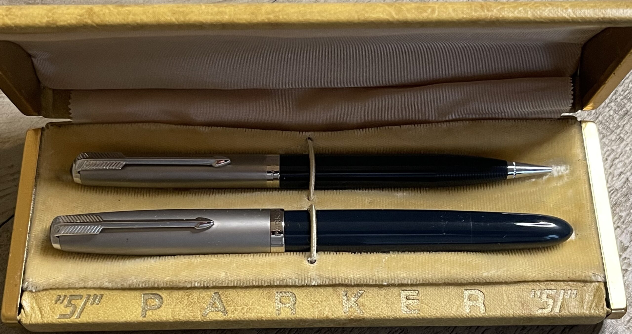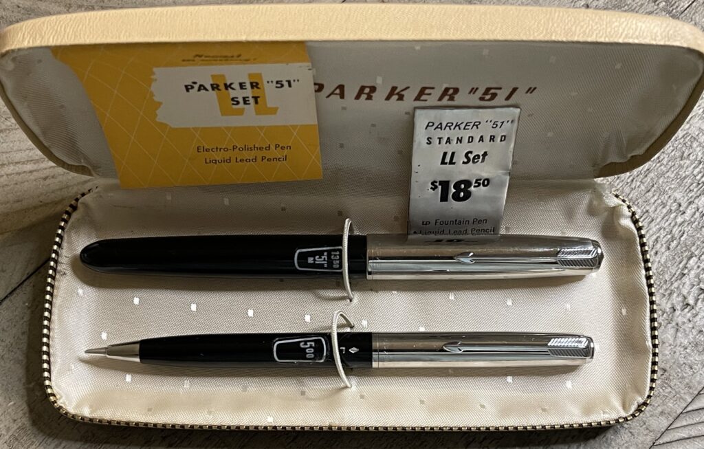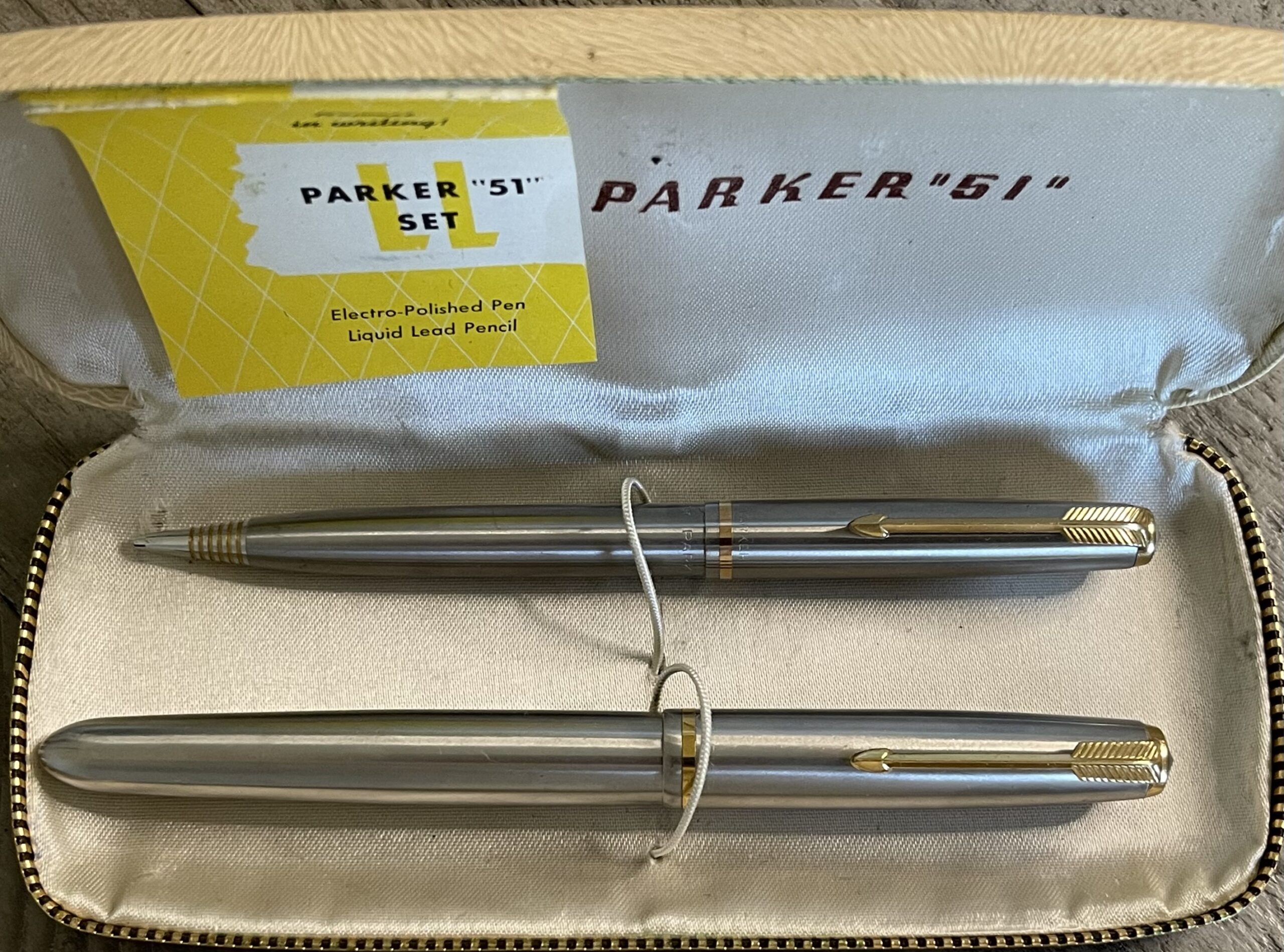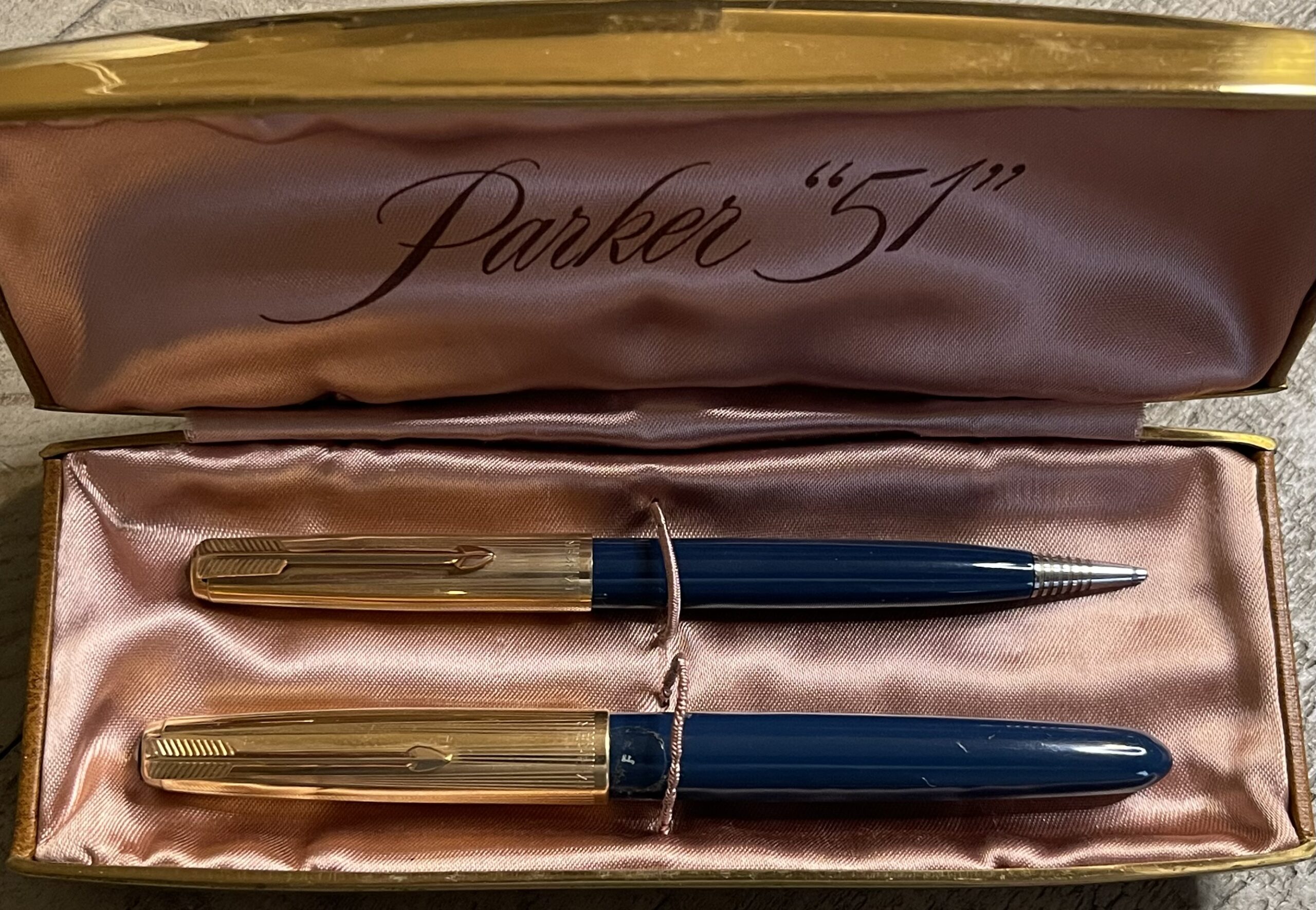 JV340. PARKER “51” Aerometric Set in Navy Gray with lustraloy caps in original box. Pen cap is used but in good condition with no dents or dings. Pencil appears mint, never used. Dated 1949. Medium 14k nib. Completely restored and working, $175