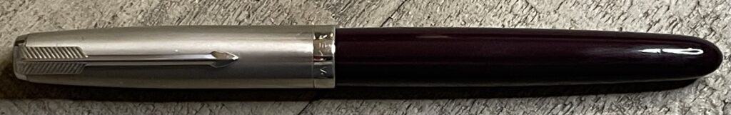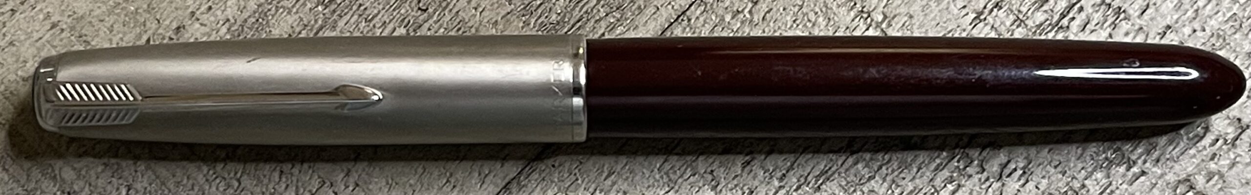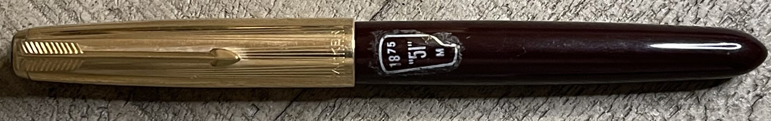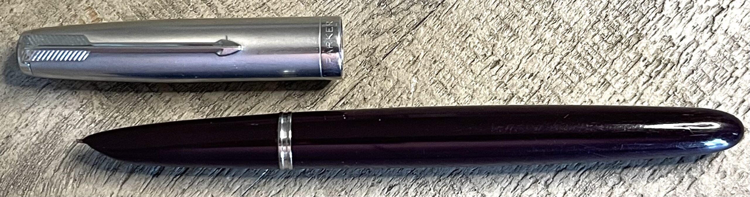 JP451. PARKER “51” Aerometric “demi” in Plum with lustraloy cap. No dents or dings. Dated 1948. Medium 14k nib. Completely restored and working, $290