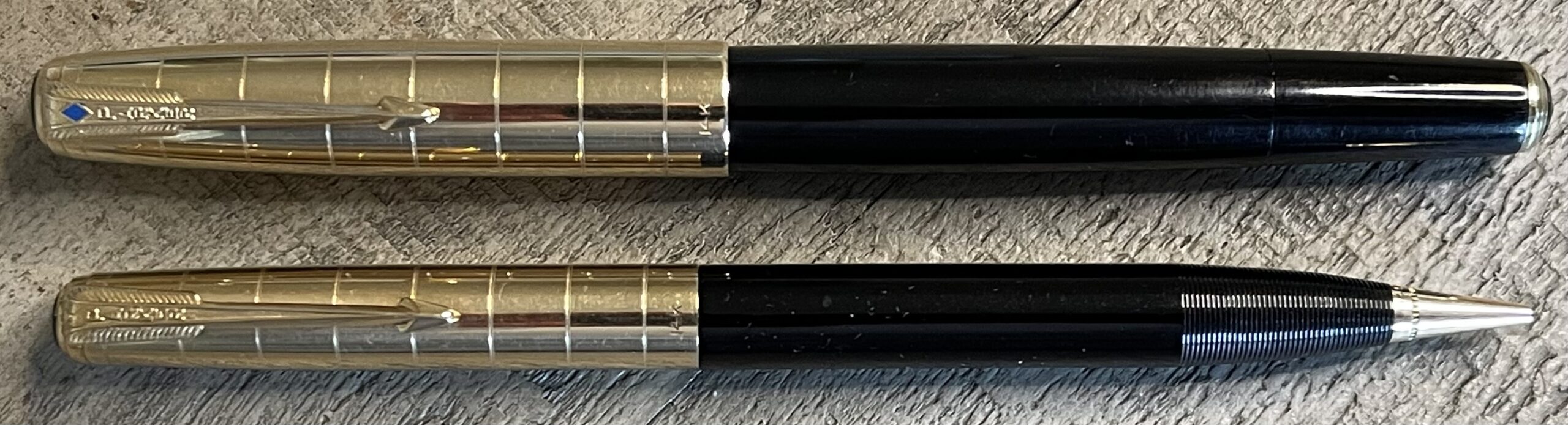 JV583. PARKER “51” Vacumatic Set in Midnight Black with Gold Filled caps. Crisp, deep converging line pattern caps with no dents or dings. Dated 1947. Medium 14k nib. Completely restored and working, $225