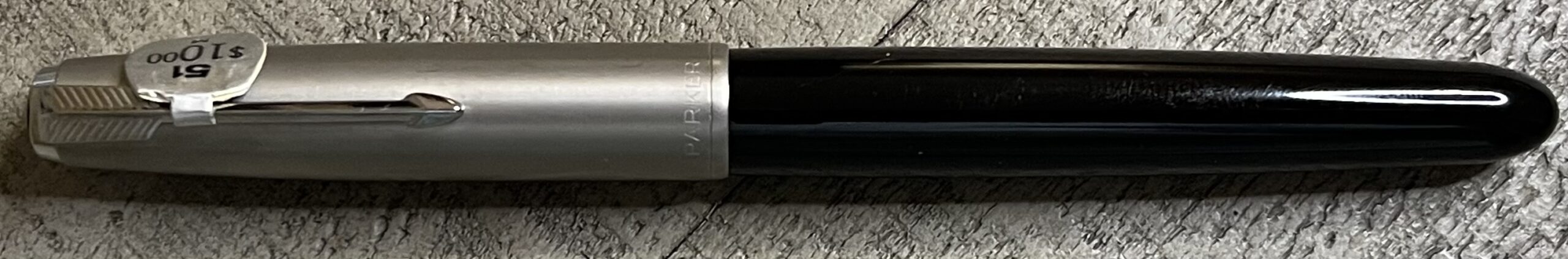JV71. PARKER “51” Aerometric in Black with Lustraloy cap. Very nice cap with just one small dent. No date code. 14k Medium nib. Completely restored and working, $160