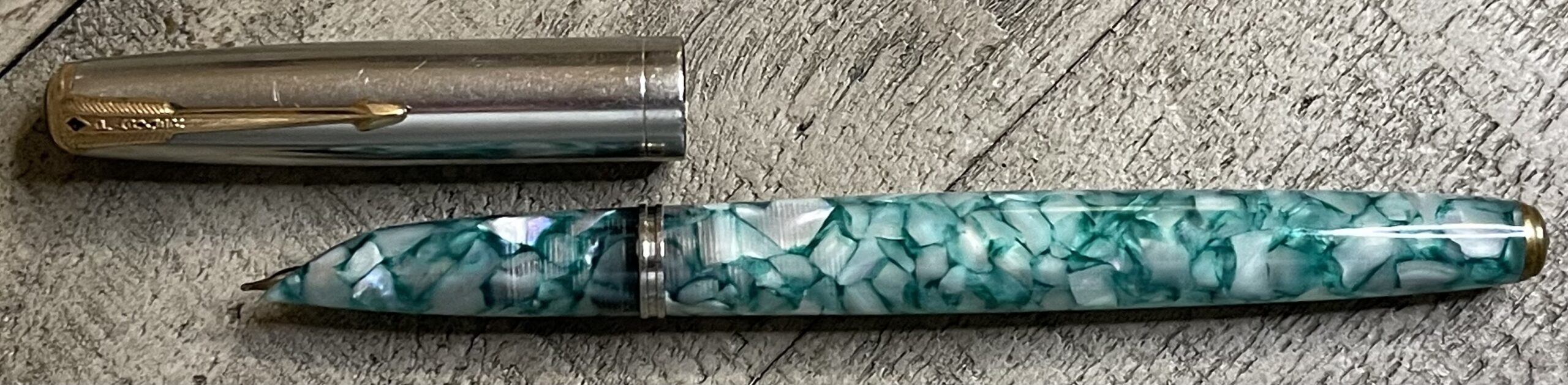 JC801. PARKER “51” Aerometric in Green Cracked Ice plastic by craftsman Ariel Kullock with Lustraloy cap. Good cap with no dents or dings. Great looking plastic. Medium 14k nib. Completely restored and working, $300