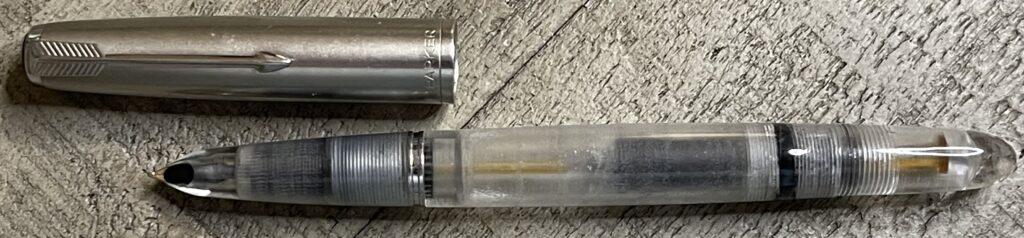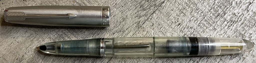 JC802. PARKER “51” Vacumatic all Clear demonstrator in plastic by craftsman Ariel Kullock with Lustraloy cap. Good cap with no dents or dings. Fine 14k nib. Completely restored and working, $200
