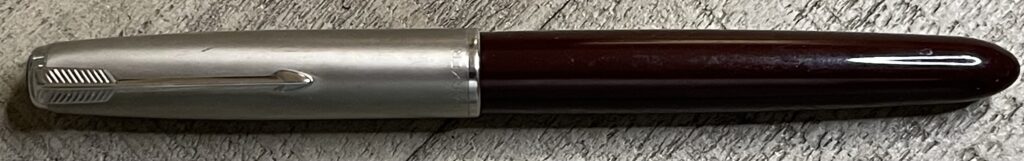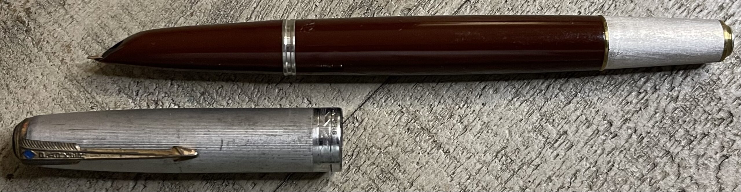 JC576. PARKER “51” Vacumatic in Cordovan Brown with Sterling Silver cap. Very nice cap with just one small ripple which is hard to see and almost all original finish. Dated 1948. Fine 14k Nib. Completely restored and working, $175