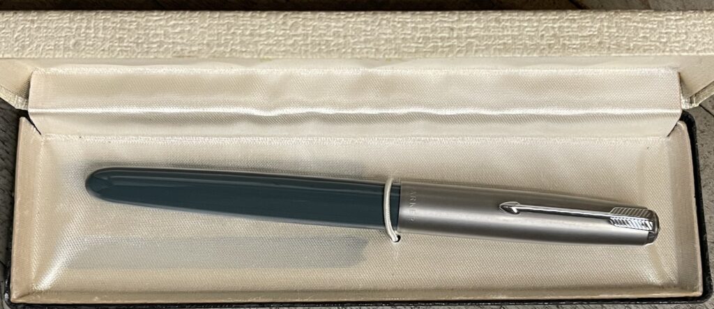 JV501. PARKER “51” Aerometric Set in Navy Gray with Lustraloy Caps. New Old Stock, never filled. Original stickers. Made in England. 14k Medium Nib. Cannot be returned if filled or dipped, $275