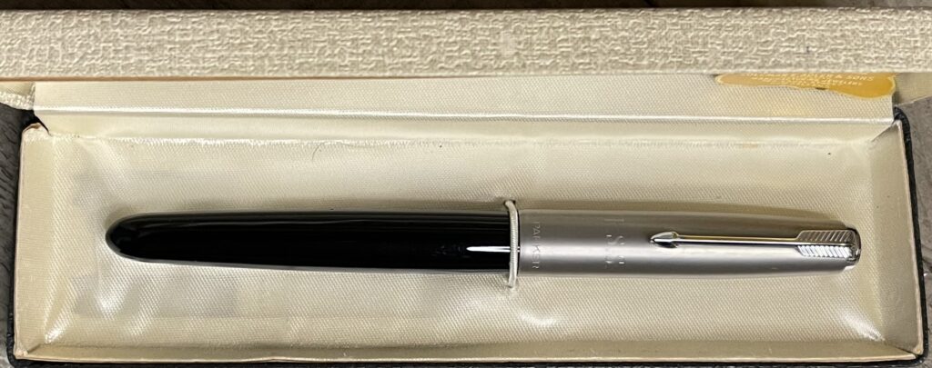 JV589. PARKER “51” Aerometric “special” in Black with Lustraloy cap. Late production pen with brushed cap. New Old stock, never filled with original hang tag. Medium octanium nib. Cannot be returned if filled or dipped, $175