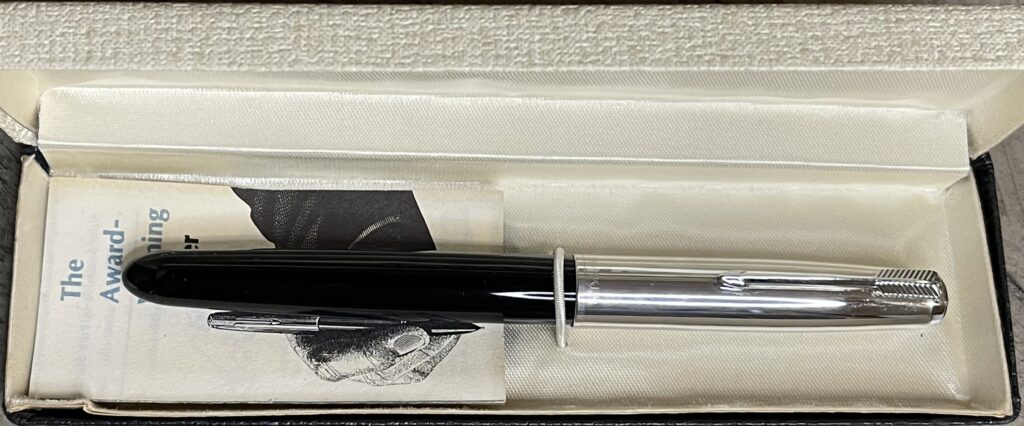 JC621. PARKER “51” Cartridge/Converter in Black with Lustraloy cap. Short production run in the early 1960s. New old stock pen in perfect condition. Fine 14k nib. Cannot be returned if filled or dipped, $550SOLD