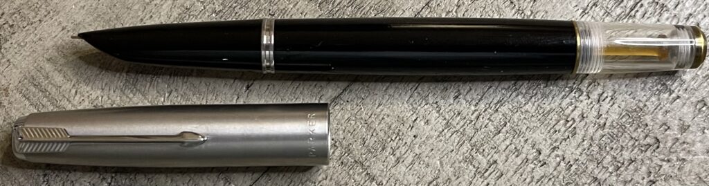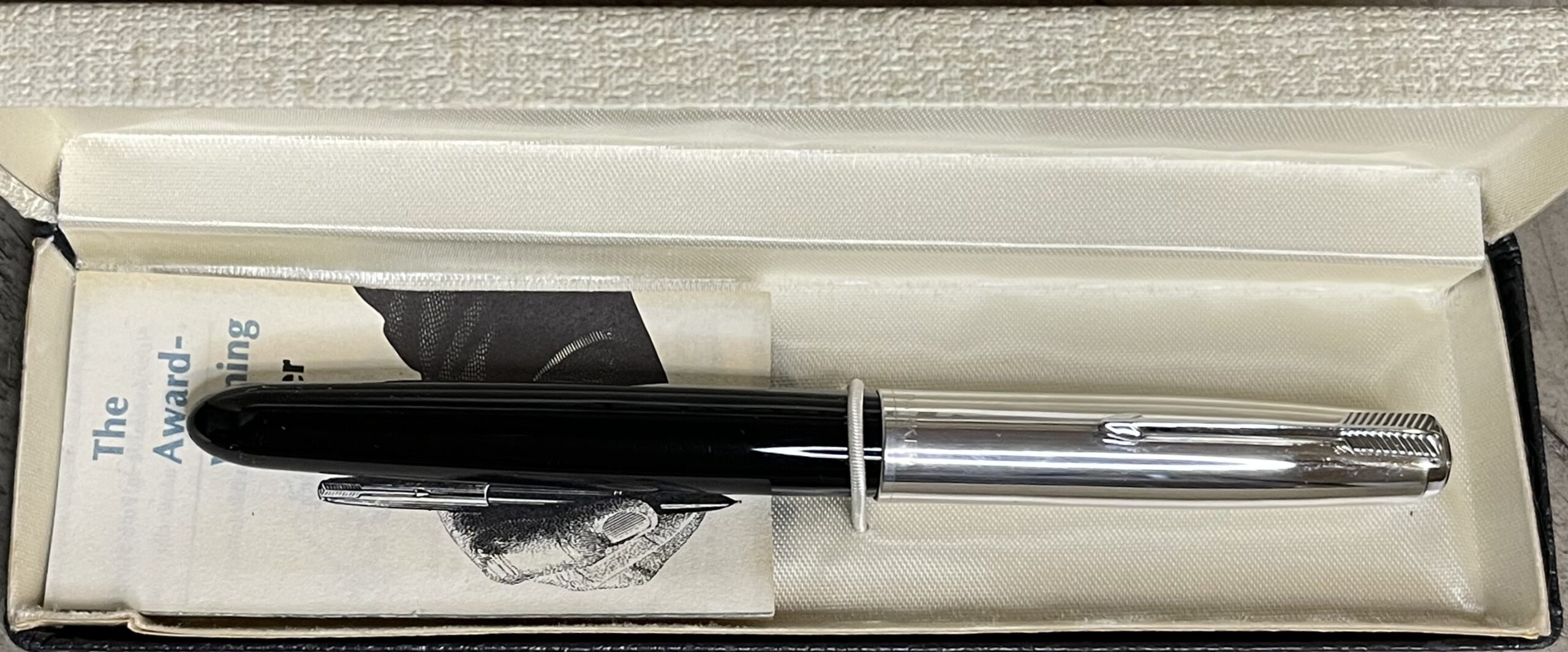 JB5. PARKER 41 Aerometric in Black with Lustraloy cap. Clean cap with no dents or dings. Fine steel nib. Completely restored and working, $100
