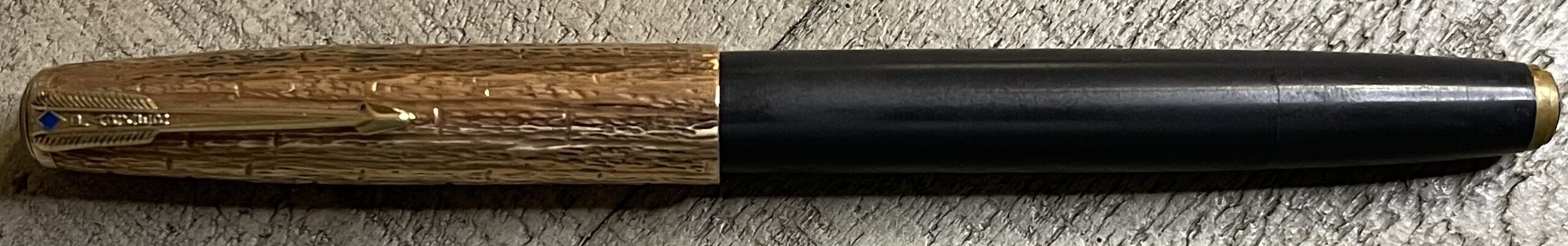 JV809. PARKER “51” vacumatic with copper “bark” cap and matte black vacumatic barrel by craftsman Ariel Kullock. Beautifully done cap and great combo with this barrel. Choice of medium or fine 14k nib. Completely restored and working, $550