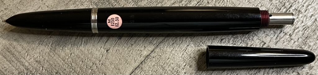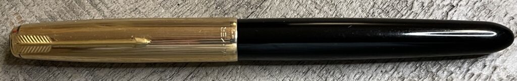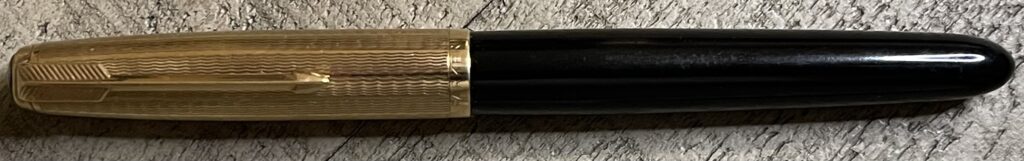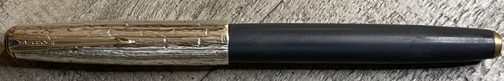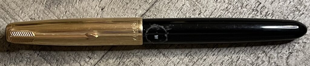 MT3. PARKER “51” Aerometric in Black with Gold Filled cap. Good cap with no dents or dings and one small flaw to plating (test mark?). Made in England. 14k Fine nib. Completely restored and working, $175SOLD