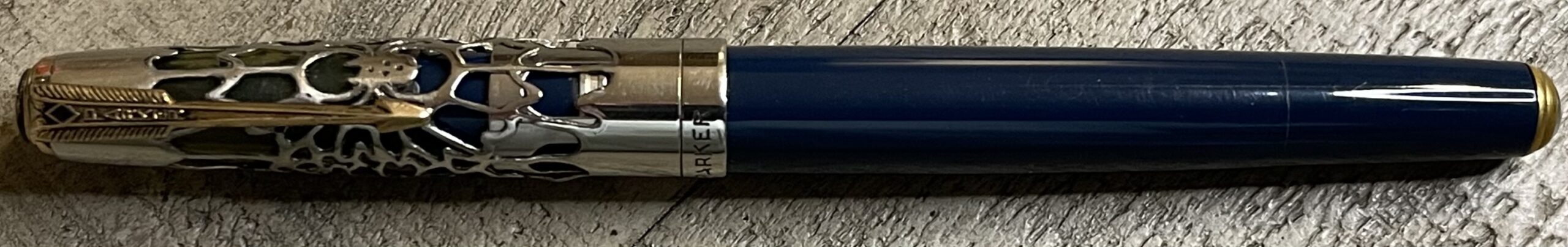 JV814. PARKER “51” Vacumatic with steel “spiderweb” open cutouts and cedar blue vacumatic barrel by craftsman Ariel Kullock. Beautifully done cap and great combo with this barrel. Choice of medium or fine 14k nib. Completely restored and working, $550