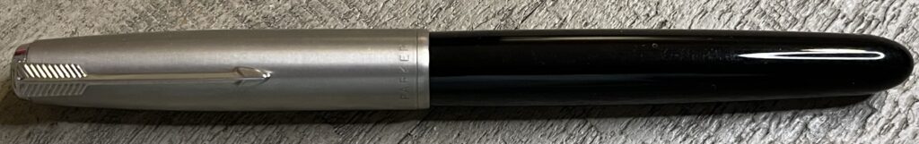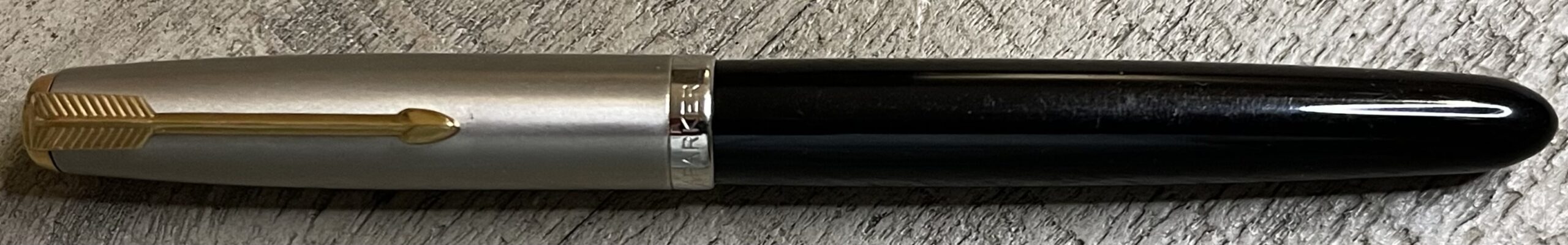 JV333. PARKER “51” Aerometric in Black with Lustraloy cap. Late production MK3 pen. Nice cap with no dents or dings. Made in England. 14k Fine nib. Completely restored and working, $160
