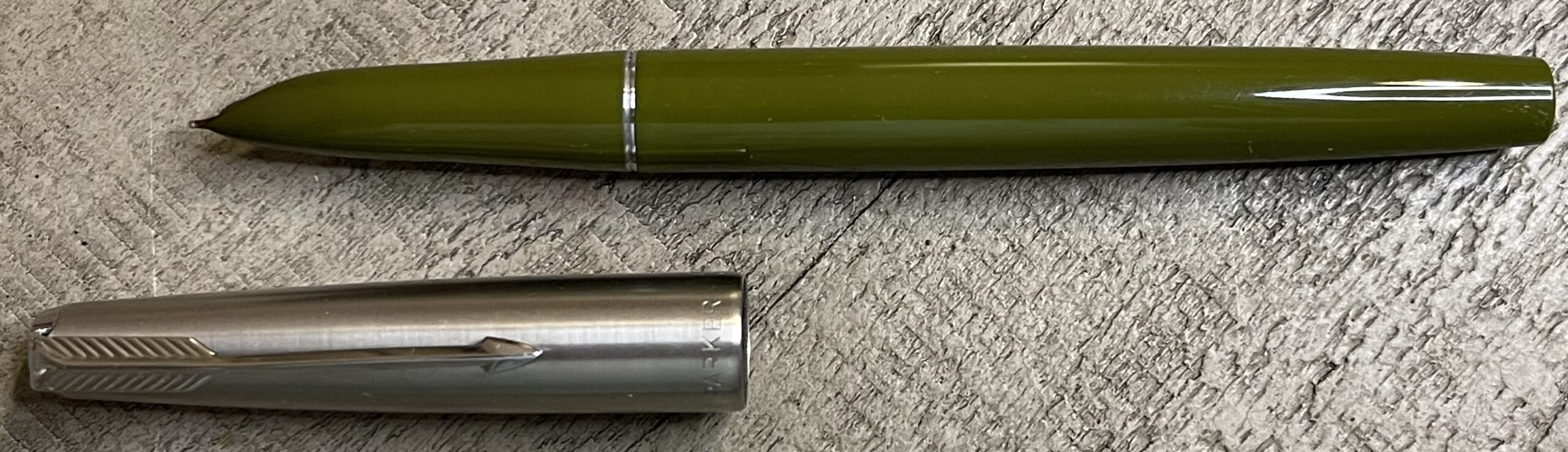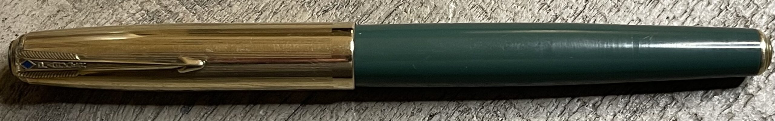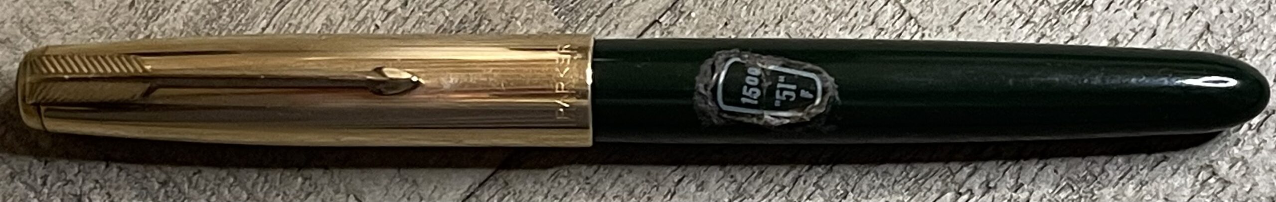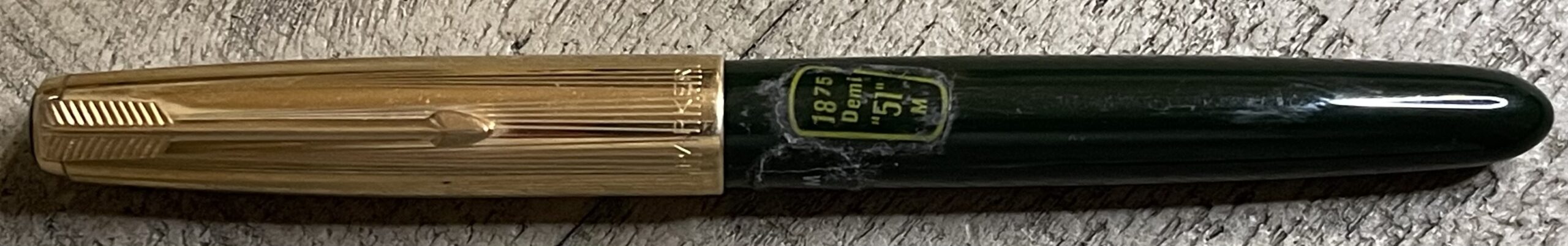 JV839. PARKER “51” Aerometric Demi in Forest Green with Gold Filled Cap. New old stock pen, never filled or used. Date code for 1951. Fine 14k nib. Cannot be returned if filled or dipped, $175