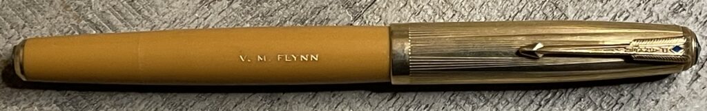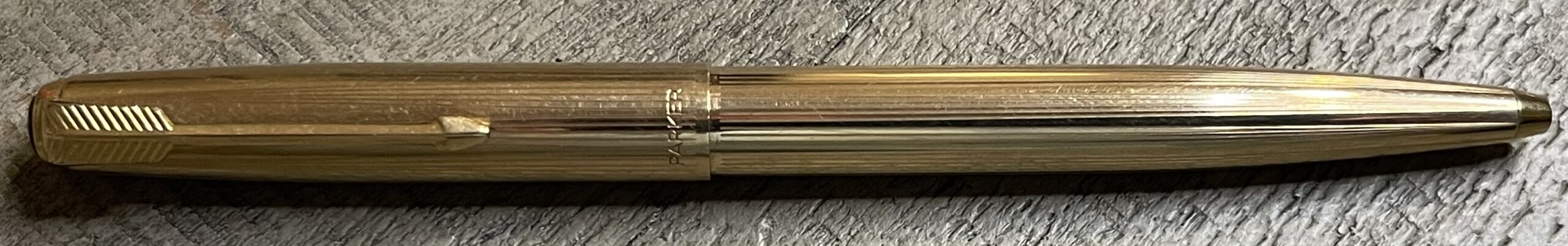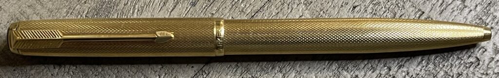 SC67. PARKER “51” Aerometric Signet in all Rolled Gold cap and barrel (gold filled).  Made in England.  Very clean pen with no dents or dings.  Barrel is engraved.  Dated 1959.  14k medium nib. Completely restored and working, $175