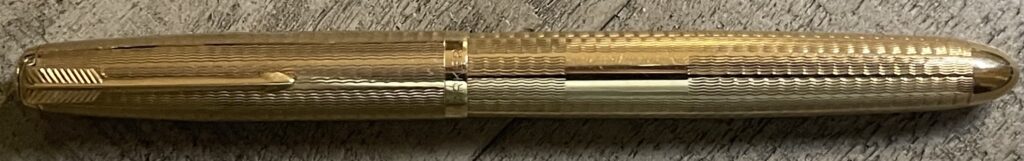 JV806. PARKER “51” Aerometric Presidential in solid 9K gold cap, barrel and clip. Squiggly line pattern. Near mint pen with no dents or engravings. Made in England. Medium 14k nib. Completely restored and working, $1,350SOLD