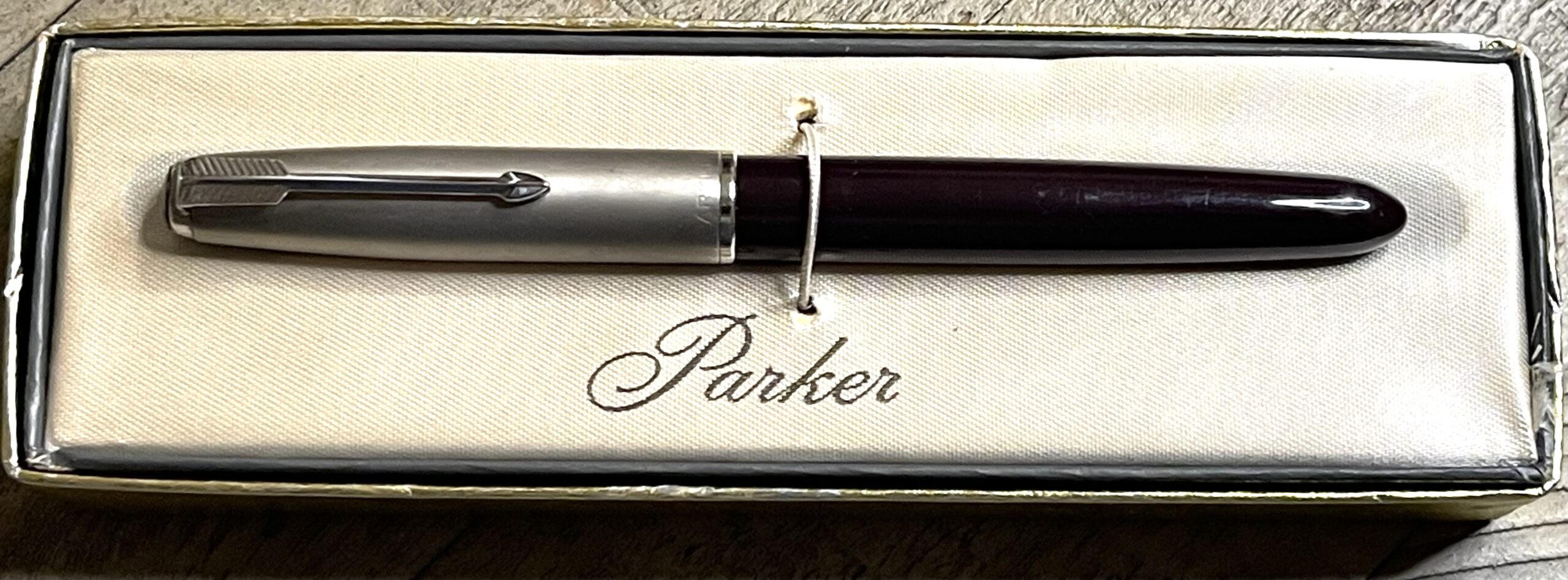 JV840. PARKER “51” Aerometric Demi in Plum with Lustraloy Cap. New old stock pen, never filled or used. Date code for 1949. Fine 14k nib. Cannot be returned if filled or dipped, $200