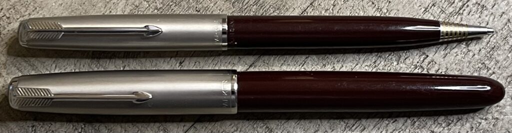 JP447. PARKER “51” Aerometric “special” in Burgundy with polished steel caps. Pen is dated 1951 and pencil is dated 1952. Near mint set. Fine octanium nib. Completely restored and working, $150