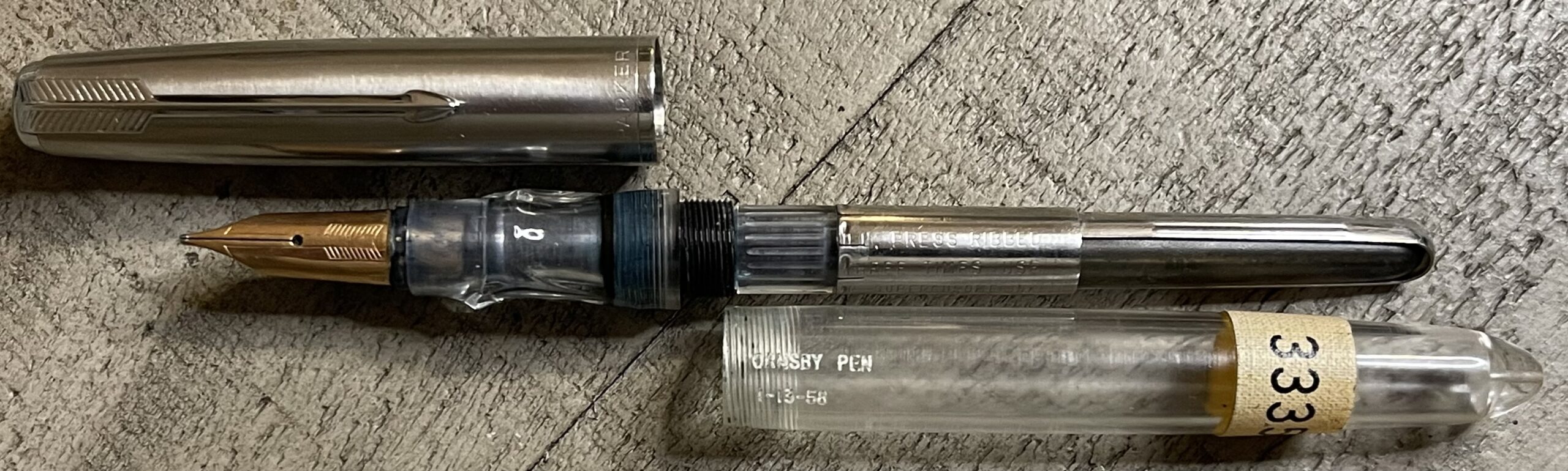 JV836. PARKER Prototypen Pen. All original Parker prototype from the machine shop. Barrel is marked “Ormsby Pen 1-13-58” and has the original tape with inventory number. Contoured adjustable section fitted with removable aerometric filler. No cracks to clear parts. 14k Medium wrap-around arrow nib. Pen is in working condition. Rare opportunity to acquire a hard to find part of Parker history, $1,500