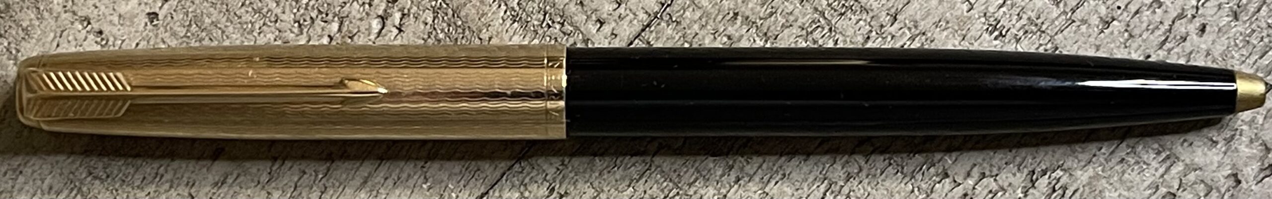 AH59. PARKER “51” MK3 in Black with Gold Filled cap. Excellent cap with no dents or dings. 14k medium nib. Made in England. Completely restored and working, $165