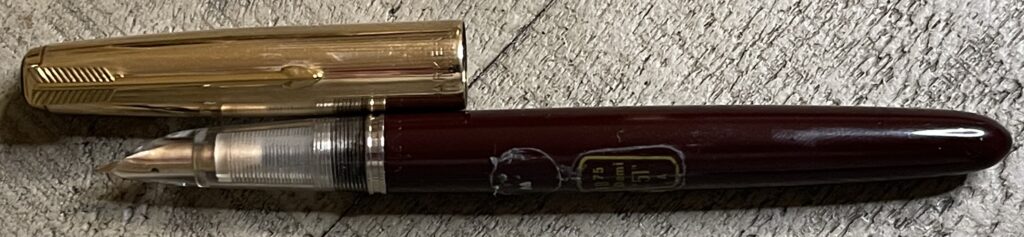 JV264. PARKER “51” Aerometric in Burgundy with Gold Filled cap. Crisp cap with no dents or dings. Made in Canada. Fine 14k nib. Completely restored and working, $195SOLD