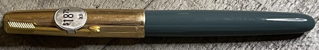JV330. PARKER “51” Vacumatic in Dove Gray with Gold Filled cap. Cap has 2-3 small dings, but presents very well. English barrel imprints with US-made cap. Medium 14k nib. Completely restored and working, $140