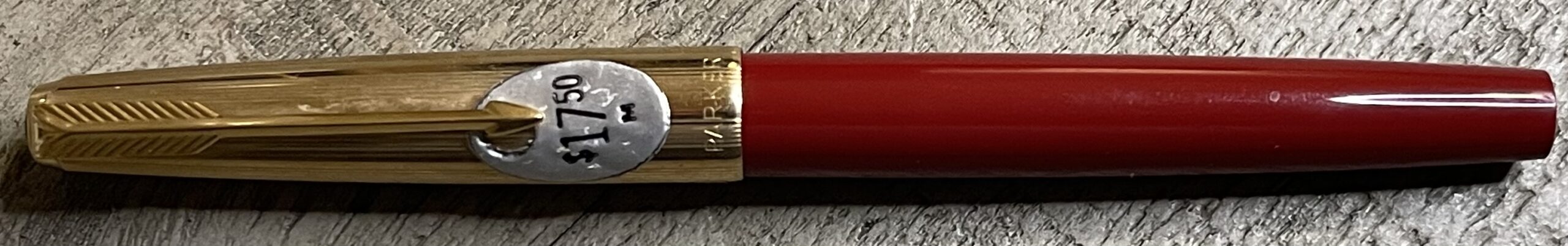 JV347. PARKER “51” Aerometric in pearlized red plastic barrel and hood by Ariel Kullock. Original Parker gold filled cap with no dents or dings. Fine 14k nib. Completely restored and working, $275