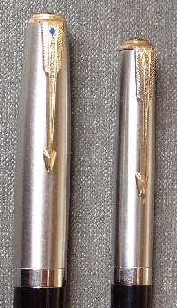 Sterling Silver caps with gold filled clips, lined pattern with chevron band. These caps all had a rhodium plating to prevent tarnish. The finish did not stand up to wear too well, wearing inconsistantly, leaving a very unattractive appearance. In addition, the soft metal is very prone to dents and dings, and finding caps in perfect condition is very hard. These caps are the most often advertised version of the vacumatic "51s" found in print ads.