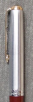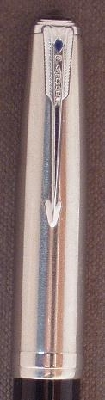 Lustroloy (stainless steel) cap with raised band and nickel plated clip. This cap had a matte finish when new. Finish was more "brushed" than the later aerometric series caps. The finish did not stand up to wear too well and quickly wore off. Have yet to find a matching pencil.