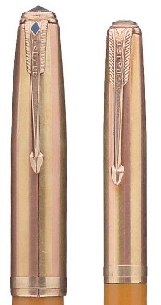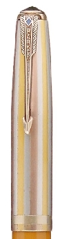 Gold Filled Caps in yellow gold with pink stripes (sometimes called "Watermelon" caps), giving it a 2-color effect. Gold filled imprint at the top of the cap near the clip. Gold filled raised "Wedding Band" applied cap band, unique to first year caps. Aluminum jewels. The original finish on these caps was a brushed finish, and then lacquered, leaving the raised band with a shiny finish. The finish did not last long and the caps acquired a shiny finish throughout. Very hard to find the matching pencil.