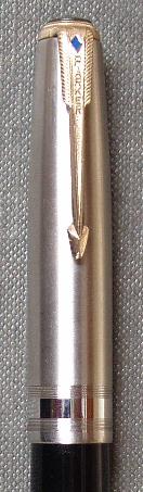 Lustroloy (stainless steel) Cap with band pattern of 7 lines, wide polished band, and 7 lines, with gold filled clip. Found on a red band filler pen dated 1946. Probably a model shop prototype cap.