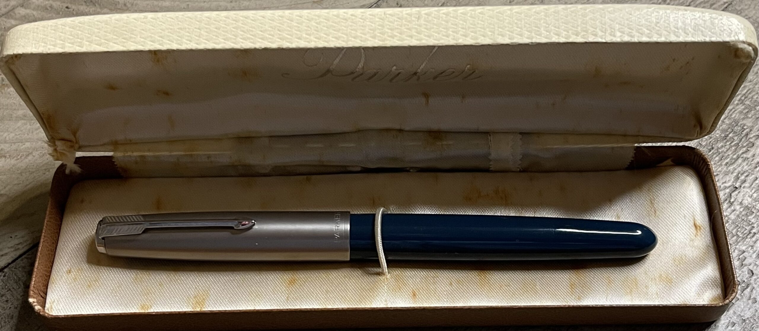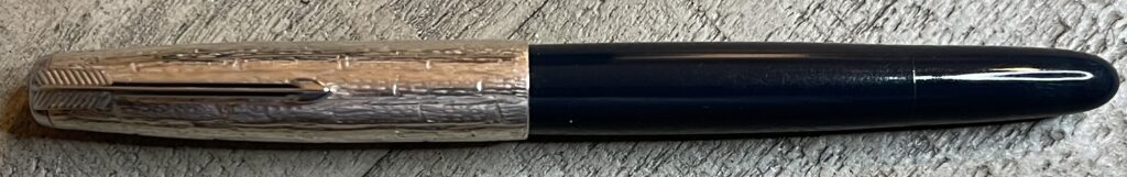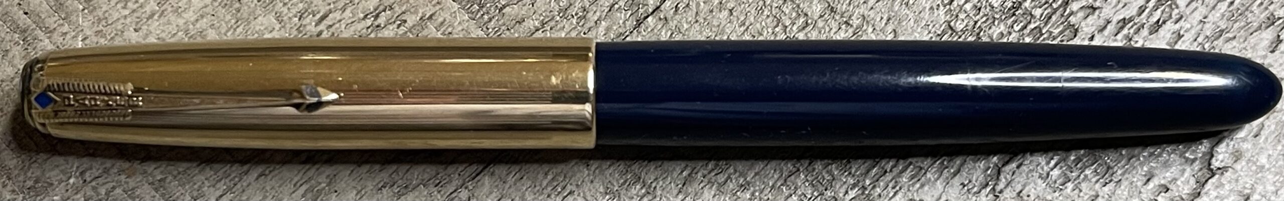 JV465. PARKER “51” Aerometric MK3 in Navy Blue with Lustraloy cap. Nice frosty cap with no dents or dings. Very late production model with squared ends. 14k medium nib. Completely restored and working, $175