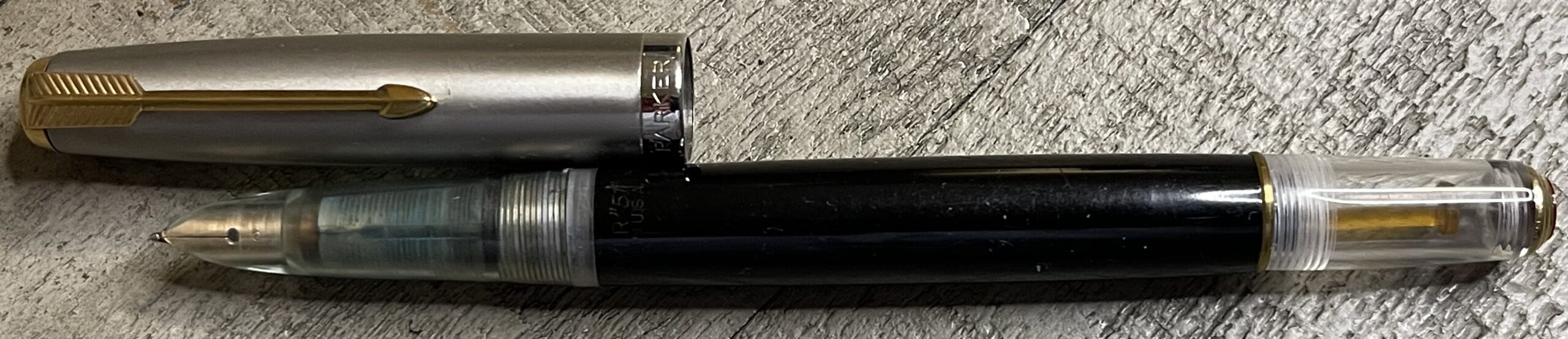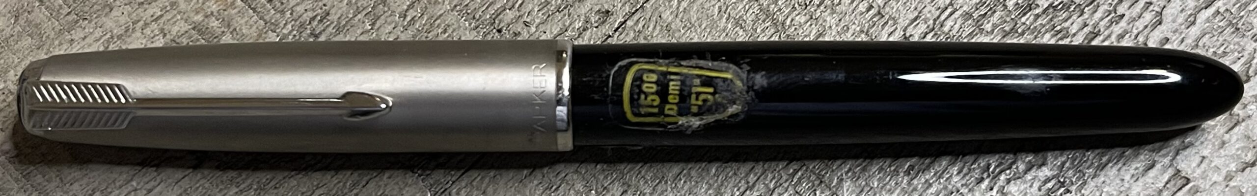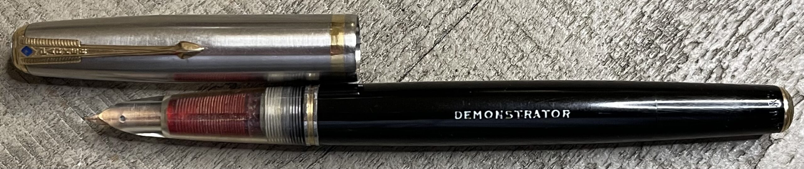 JC912. PARKER “51” Aerometric Half Demonstrator in Black with Lustraloy cap. Sold to the public as a marketing tool. Clean cap with no dents or dings. Date code of 1948. Fine 14k nib. Completely restored and working, $225