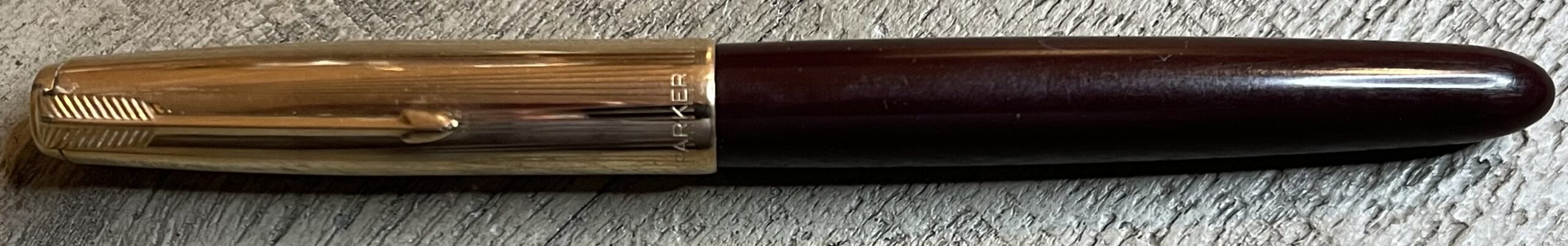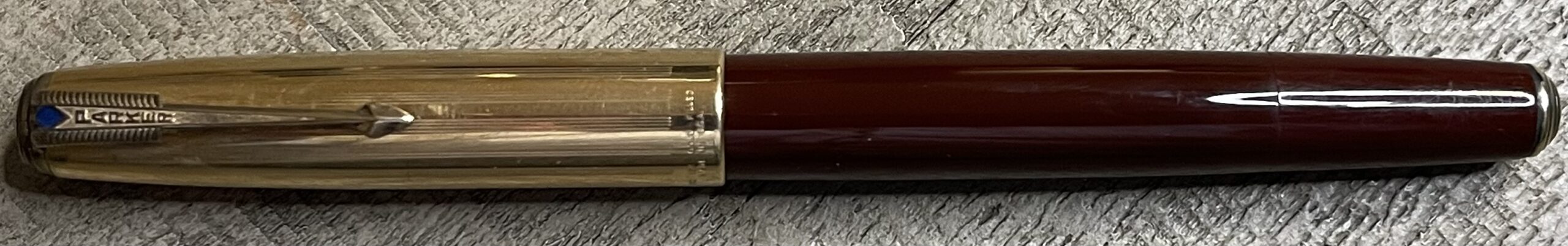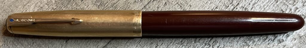JC872. PARKER “51” Aerometric in Burgundy “bloody red” with Rolled Gold cap. Transition pen with rounded barrel and later thin clutch and 61-like cap. Perfect cap with no dents or dings. Made in England. Broad 14k nib. Completely restored and working, $185SOLD