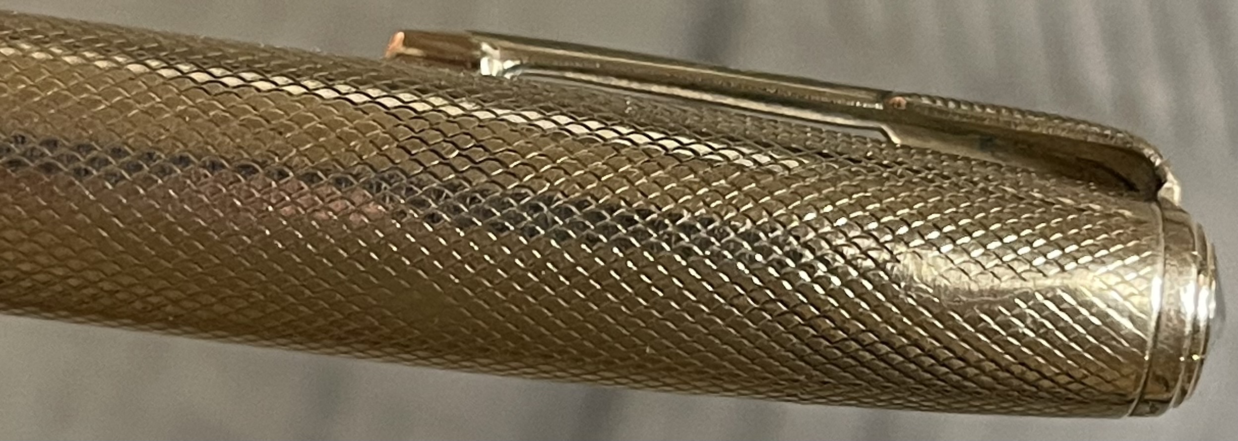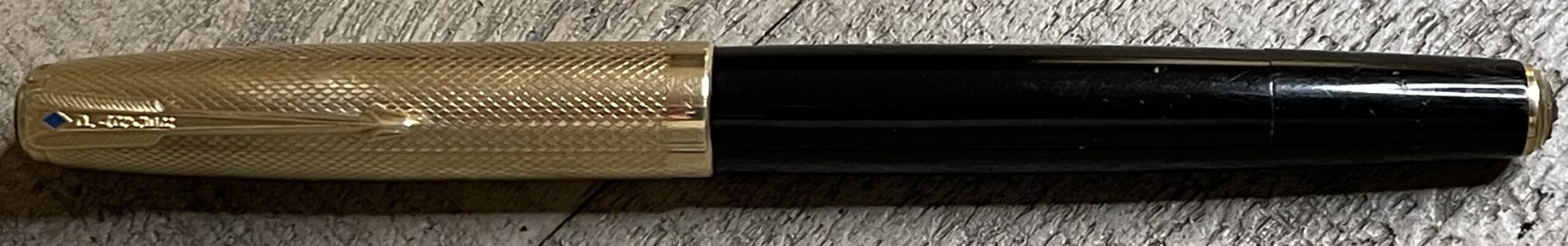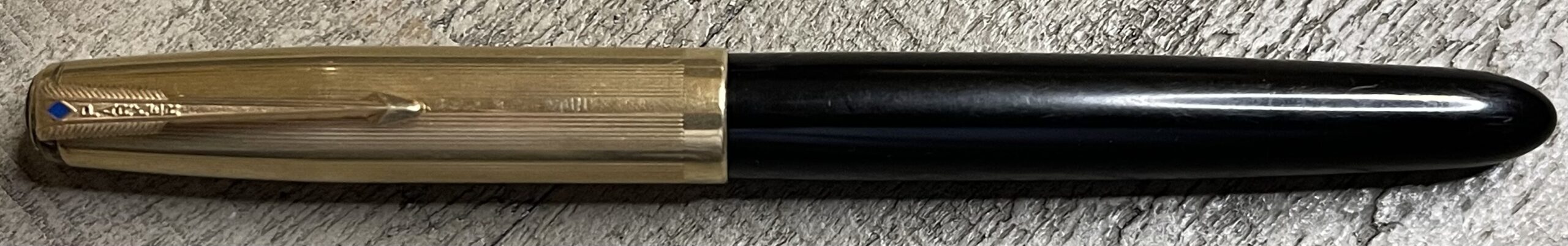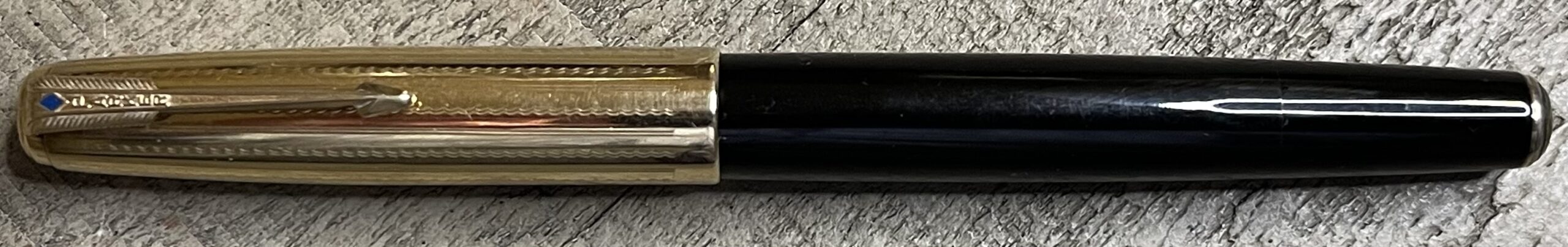 JV901. PARKER “51” Vacumatic Double Jewel with 14k Solid Gold Heirloom cap in Fishscale pattern. Cap, clip and tassie ring clearly hallmarked 14k. It appears that someone at some point possibly stepped on this cap and it developed 2 cracks. The cracks are repaired and the cap is sound but the repairs remain visible. No dents or dings. Date code of 1948. Would make a great everyday pen for regular use at not much over melt price of the cap. 14k Fine nib. Completely restored and working, $1,250SOLD
