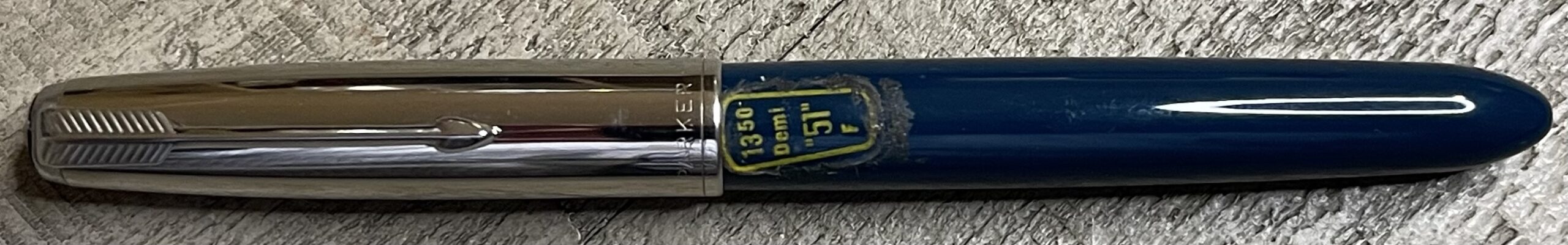 JV833. PARKER “51” Aerometric Demi in Midnight Blue with Gold Filled Cap. New old stock pen, never filled or used. Date code for 1950. Fine 14k nib. Cannot be returned if filled or dipped, $175