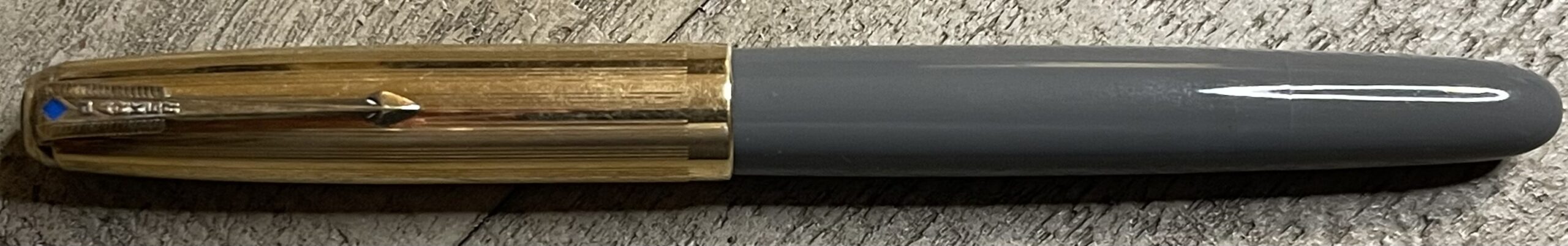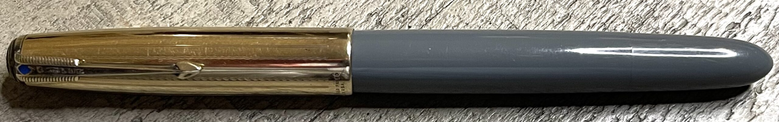 JV893. PARKER “51” Vacumatic in Dove Gray with Gold Filled cap. Beautiful, crisp cap with scalloped/lines pattern, with no dents or dings. Dated 1945. Fine 14k nib. Completely restored and working, $190SOLD