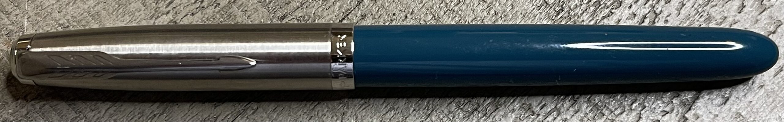 JV898. NEW Parker “51” in Teal Blue with Brushed Steel cap. Near mint pen with no damage. Fine steel nib. Cartridge or converter Filled. Working perfectly, $125