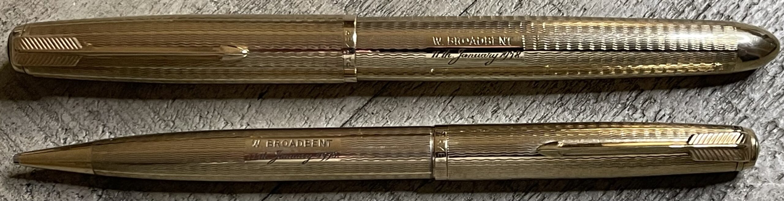 JV899. PARKER “51” Aerometric Presidential Set with mechanical pencil in 9K Solid Gold cap, barrel and clip. Squiggly line pattern. All parts are clearly hallmarked .375 for 9K gold. Made in England. No dents or dings. Name and dedication engraved. 14k medium nib. Completely restored and working, $1,950