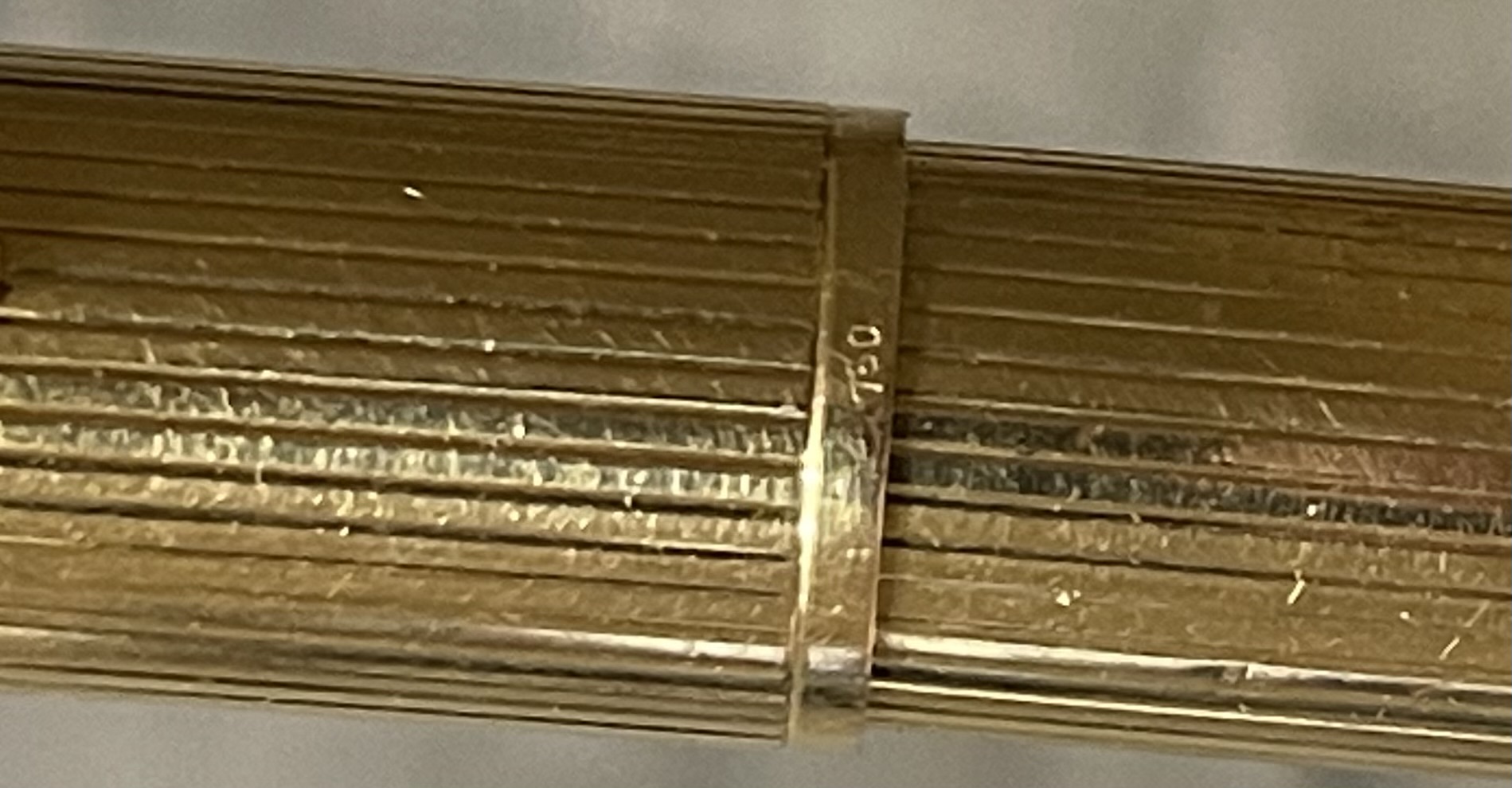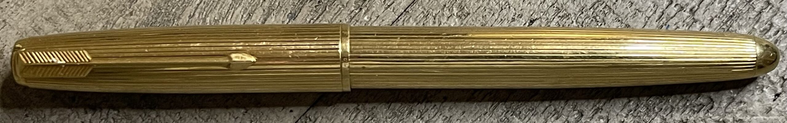 JV900. PARKER “51” Aerometric Presidential in 18K Gold. Lined pattern on cap and barrel. Hallmarked .750. Probably made in Germany under contract from Parker. Pen shows no significant dents but shows marks and flea bites mostly due to the softer metal. Teal blue section with 14k Broad nib. Completely restored and working, $2,100SOLD