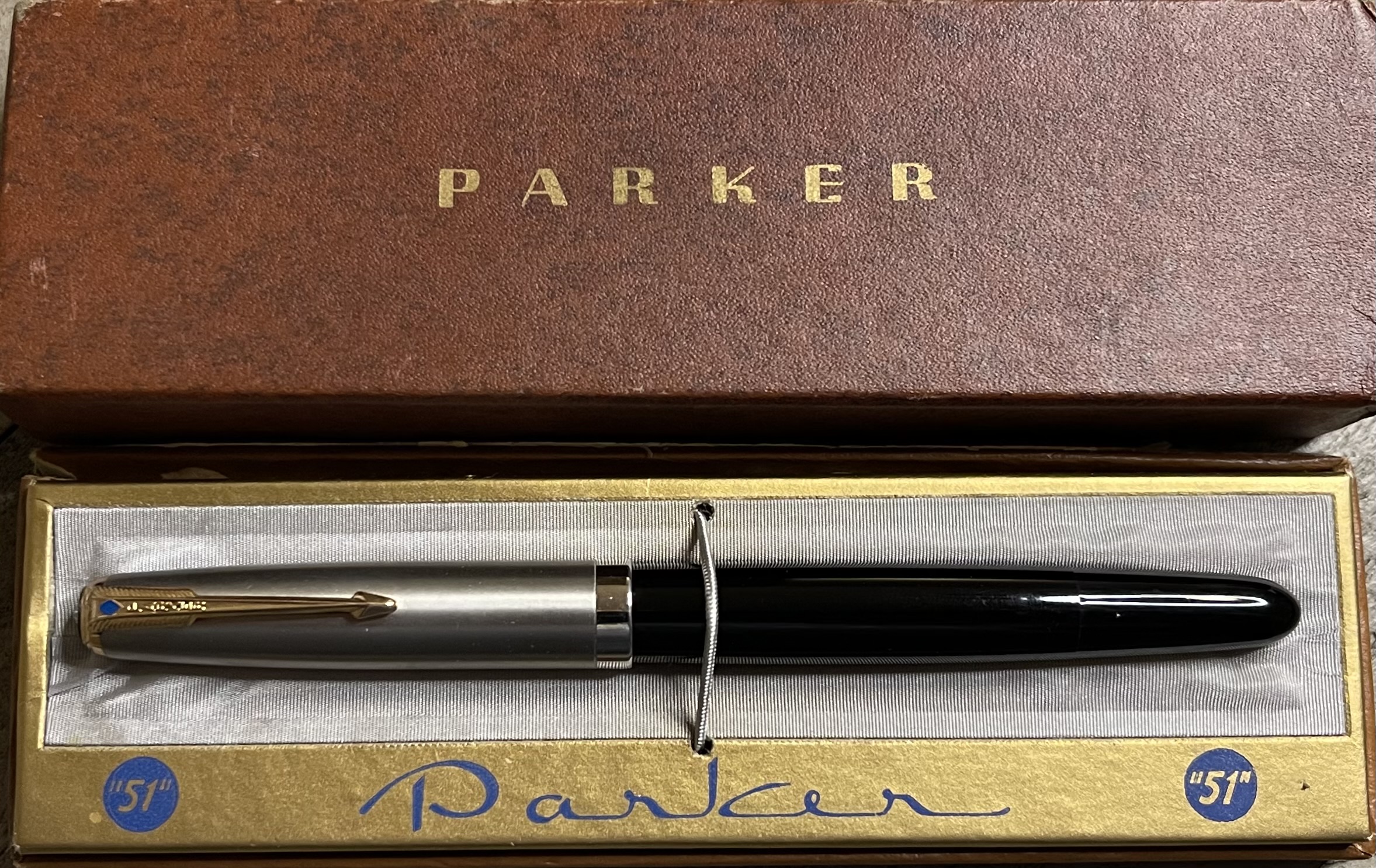 JC819. PARKER “51” Aerometric in Navy Gray with Lustraloy cap in original box. Mint, new old stock pen, never filled. Late edition with brushed cap, pearl jewel and 14k nib but “special” filler sleeve. Fine 14k nib. Cannot be returned if filled or dipped, $210