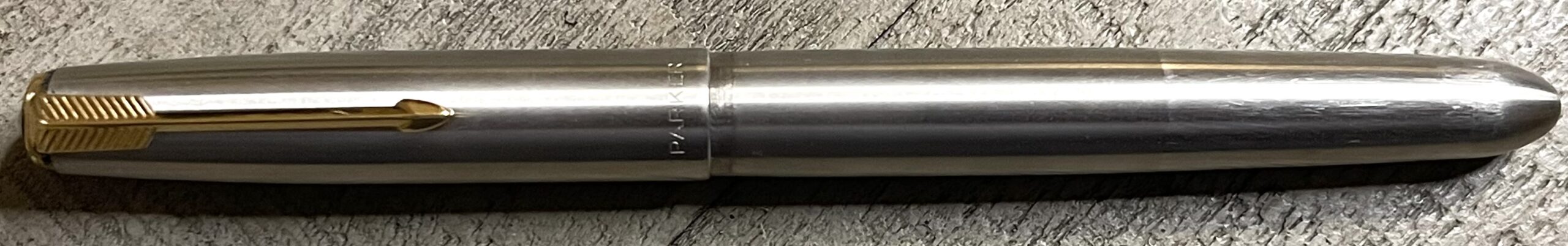 JV746. PARKER “51” Aerometric Flighter in all Steel Cap and Barrel. Shows wear from use but no dents or dings. No date code. Medium 14k nib. Completely restored and working, $225SOLD