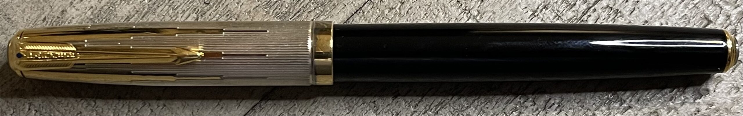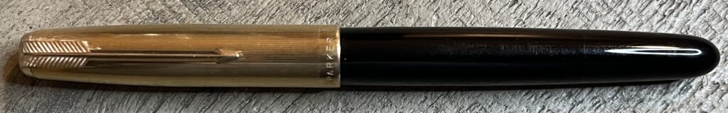 JC882. PARKER “51” Aerometric in Black with Rolled Silver cap. Crisp, minty cap with perfect finish. Medium 14k nib. Completely restored and working, $240SOLD