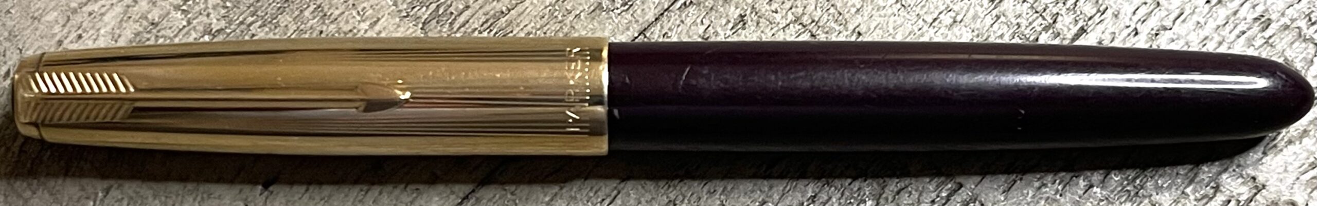 JV677. PARKER “51” Aerometric Demi in Plum with Gold Filled cap. Only produced for 2 years. Very clean cap with no dents or dings. Dated 1949. Fine 14k nib. Completely restored and working, $275