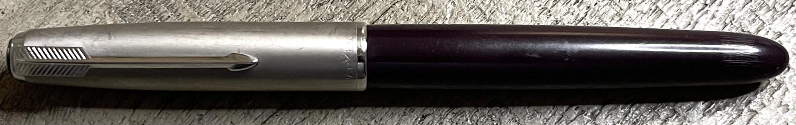 JP451. PARKER “51” Aerometric “demi” in Plum with lustraloy cap. No dents or dings. Dated 1948. Medium 14k nib. Completely restored and working, $290