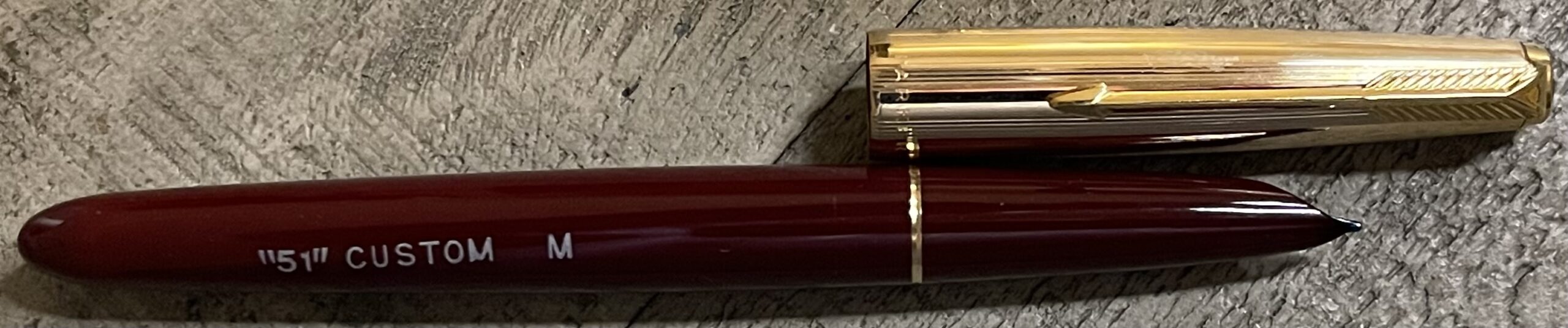 JC883. PARKER “51” Aerometric in Burgundy “bloody red” with Rolled Gold cap. Great cap with no dents or dings. 14k medium nib. Completely restored and working, $190SOLD