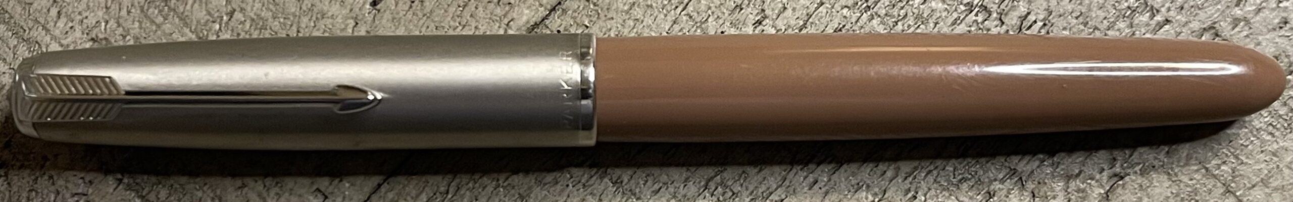 JC905. PARKER “51” Aerometric “bandless” Flighter in Lustraloy cap and barrel. Very uncommon pen made for only a 1-2 years at the end of Flighter production. The caps for these pens are unique to this model so that an earlier Flighter with any lustraloy cap cannot be correct. This one is all correct with the right cap and some use and posting marks from removing the cap, but retains most of its original finish with no dents or dings. Fine 14k nib. Completely restored and working, $500