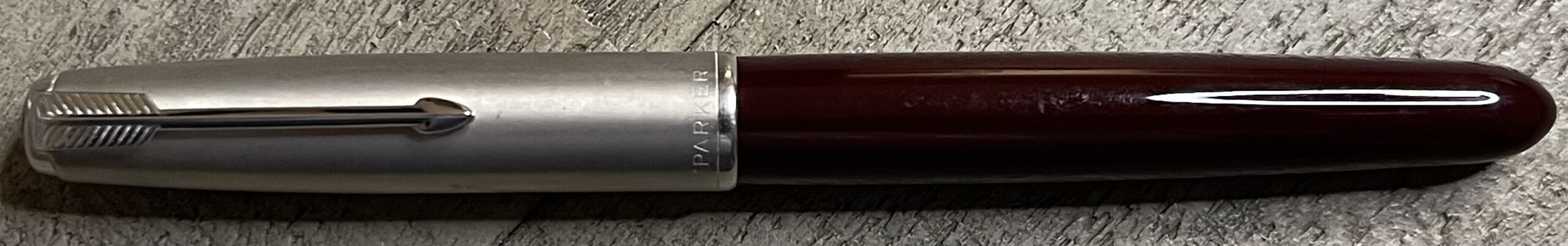 JC875. PARKER “51” Aerometric “special” in Burgundy with Lustraloy cap. Perfect brushed later cap with “51” on the sides. Fine octanium nib. Completely restored and working, $120SOLD
