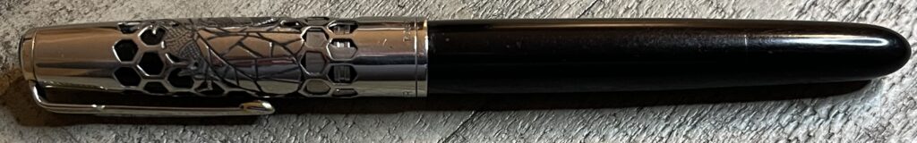 JV940. PARKER “51” Vacumatic in Midnight Black with Beehive design Lustraloy cap by Ariel Kullock. Beautiful open design with great workmanship. Date code of 1946. Fine 14k nib. Completely restored working, $400