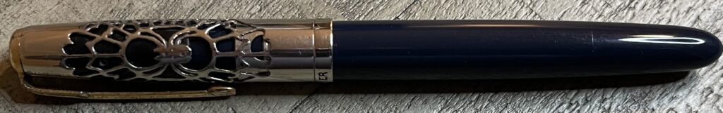 JV937. PARKER “51” Vacumatic in Cedar Blue with Spiderweb design Lustraloy cap by Ariel Kullock. Beautiful open design with great workmanship. Date code of 1943. Fine 14k nib. Completely restored working, $400