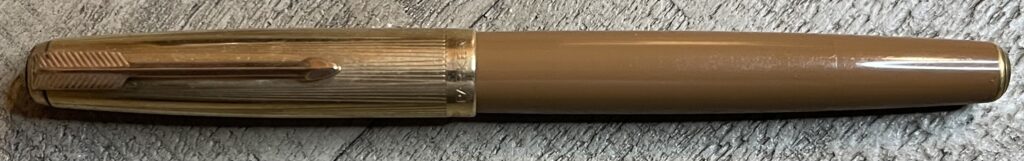 JC934. PARKER “51” Vacumatic in Buckskin Beige with Gold Filled cap. Clean cap with no dents or dings. Date code of 1948. Correct transition cap. Broad 14k nib. Completely restored and working, $375